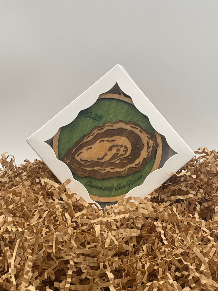 This year’s design continues our tradition of creating small-batch wooden ornaments that celebrate the beauty and spirit of life by the sea. Featuring an engraved oyster on a green background, it’s a simple, elegant nod to the place we call home.